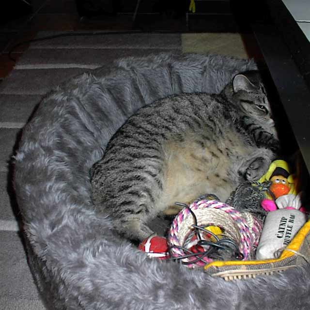 The basket is dobermann-sized, the biggest I could find. Personally I prefer to sleep without a clutter of toys in bed, but I'm not a cat, am I.