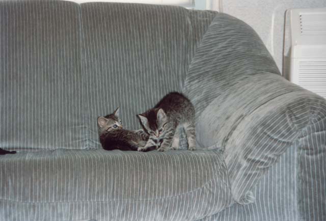 Playing together on the couch. Imagine how big a human must look to small kittens like these.
